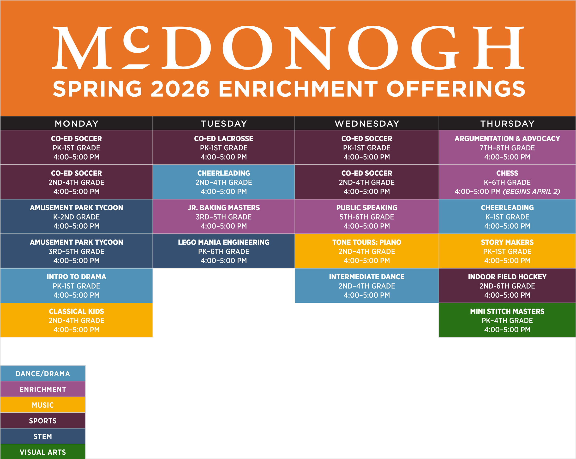 See a snapshot of our offerings for the upcoming season on the chart below, and scroll down for more details about all the fun activities that will be happening after school this spring at McDonogh!